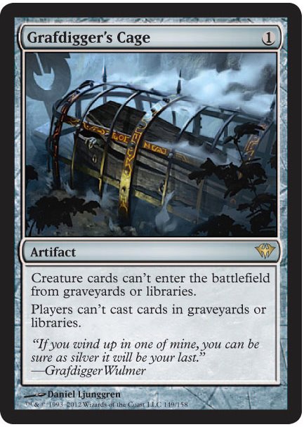 - Grafdigger’s Cage – 1 mana artifact, can be played in any deck. Stops cards from being played from the graveyard or entering from it, also shuts down Flashback. With one or two of these, you can shut down a variety of decks. Burning Vengeance is destroyed by it. FRITES (the 4 color mana, Unburial Rites/Norn deck) also is heavily damaged by it, especially if you can counter any artifact destruction spells or bring your Cage back from your graveyard. Solar Flare also will have trouble if you get one of these out. Flare runs Lilliana, Sun Titan, and Phantasmal Images. If you stop those images from coming back, you more than HALVE their fighting power. UB Zombies also hurts against the Cage. Gravecrawler will be stuck in the graveyard, and Geralf’s Messenger will not be able to activate its undying ability. Decks using Birthing Pod/Green Sun will also be heavily hurt by the Cage. And although not many people are using U/B/W Spirits these days, shutting down Lingering Souls flashback ability make their deck a little slower, and just might buy you enough time to get a defense up. This card is a MUST have in the current metagame!
