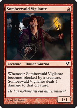 There are so many humans in Avacyn Restored that this wouldn’t be a bad card to have one or two of in a deck. The fact that you can have it deal one damage to creature OR player is great. Put 3 Humans in play and suddenly you have an Incinerate. This will definitely see play with Gather the Townsfolk in standard play. It also combos well with the vampire above.