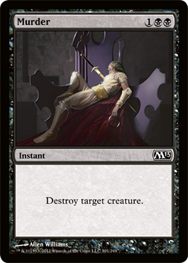 Doomblade is going, as well as Go for the Throat, but in it’s place we get Murder. No drawbacks, no restrictions, just kill something. The extra mana is more than worth it. One or two of these in a sealed tourney would be worth their weight in gold against the big creatures later on in the game. There aren’t any indestructible cards in M13, and only one or two Hexproof creatures I believe, so you’ll have plenty of targets to throw this at. A little hard to splash, but running a two color deck with black is doable.