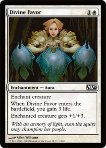 The last card I’d like to recommend is Ajani’s Sunstriker. It’s nothing special, just a 2/2 for 2 mana and has lifelink. It never hurts to have a little extra life, especially if you’re in a race with your opponent to see who can get out the most creatures. When you’re trading punches back and forth, the person that can keep their head above water the longest will win. By throwing on an enchantment like Divine Favor, you can let this guy sit back and absorb the hits and keep gaining life. At two white mana he might be difficult to splash in to a 3 color deck, but you should be fine with two colors.