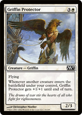 Griffin’s form past sets have kinda sucked, but this guy is decent. A 2/3 flyer for 4 mana is doable, but what I like about him the most is his ability. In a white weenie/token deck he’d be pretty amazing. Consider comboing this card with Talrand’s Invocation (or Talrand himself), Attended Knight, Captain’s Call, Captain of the Watch, or any other card that puts more than 1 creature onto the battlefield and suddenly you have a pretty beefy bird ready to divebomb into your opponent (Captain of the Watch would make him a 6/7 flyer! With exalted it could be even more!).