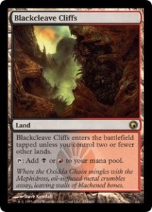 Rakdos looks like it’s going to be one of the first guilds in RTR, so Black/Red should get a pain land to compensate for the loss of Blackcleave Cliffs. Dragonskull Summit (M13) and the Cliffs are staples of BR control decks, and have seen more play recently in Grixis control and Grixis Zombie decks, but I don’t think either of these decks will be hurt much by it’s rotation. There will definitely be more BR stuff in RTR to fill the void.