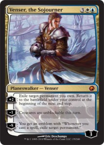Without Venser, blink decks will become a little more bearable. I went up against a Bant (GWU) blink deck with Venser, Restoration Angels, and Acidic Slimes the other day and got steam rolled. It’s incredibly powerful against control decks, quickly destroying all of your land, and if you can’t take care of Venser in time, his -8 ability will destroy you. It’s pretty much game over if they ultimate. Venser lock decks with Stonehorn Dignitary will also become a thing of the past once he rotates. Blink decks will get a little weaker, but I think they will be able to switch out Venser for a Conjurer’s Closet (AVR) for the same mana cost. The closet can be destroyed easier, but that’s why you’d run cards like Trading Post along side it to bring it back into play. Just a thought.