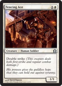 Fencing Ace is pretty sweet for an uncommon. He’d do best with some attack bonuses however. This could be an enchantment in a Azorius deck, or if you’re playing a Selesnya/Golgari deck, why not scavenge some creatures and slap their bonus on him? With even one +1/+1 counter he becomes a dangerous card, and with 2? He could quickly end the game if you can give him evasion. If you do play him, definitely find some way to boost that power as soon as possible. Pursuit of Flight in red would be awesome on him in an Izzet/Azorius deck as well. A 3/3 double striking flyer on turn 3 would be pretty hard to beat. Hopefully you’d have the mana for it though!