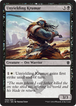 Unyielding Krumar will force you into playing either with Abzan or Mardu colors, but I think being able to activate his ability is worth it. A 3/3 body for 4 mana and activated first strike is economical for a common card. It fits your curve well and it’s 3 power/toughness will be able to take care of most of the non-multicolor cards you’ll go up against. He’ll especially be more effective in sealed due to the randomness of what cards you end up with. Your opponent might have 3-4 cards that are better than him, but he should have no problem with the rest. His value drops a little bit in draft but I still see him as a roleplayer in your deck regardless. I’d take him as my 6th-7th pick.