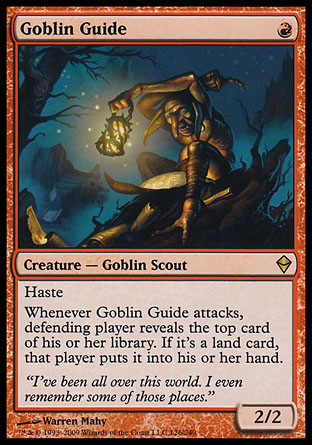 4 ofs in Burn, UR Delver, Zoo decks, sees play in Legacy as well . . . Goblin Guide shot up to over $30 not too long ago, and has only recently dropped in value. It’s still more than double the price it was a year ago. Wizards would be crazy not to reprint this card. Sure Monastery Swiftspear from Khans of Tarkir has taken some pressure off of it as the premier 1 drop attacker, but it would make a lot of players happy to be able to pick this up for $12-$15 instead of $20-$30.