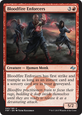 In a Jeskai Prowess deck, Bloodfire Enforcers shouldn’t have a problem activating their second ability. A 5/2 creature for 4 mana is a good way to fill out your curve in a quick Jeskai build, and there are plenty of playable white and blue instants and sorceries to help use. Jeskai always struggled with finishers in KTK limited, but I think the Enforcers can do a good job of finishing games from time to time. Although it looks like a glass cannon that would die to any attack, you could very easily trick your opponent by playing an instant to suddenly turn on it’s first strike. Not a high pick, but something I probably wouldn’t cut out of my sealed pool.