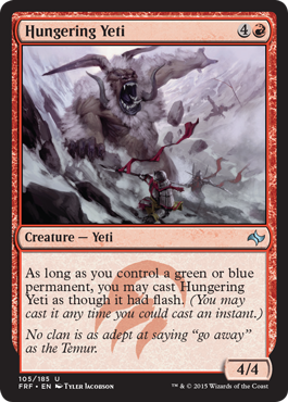 I’ve noticed that there are a lot more 4 power creatures overall in KTK/FRF limited now, and that means you can activate all those Ferocious triggers a lot easier. Temur is a decent clan to play with, but even if you don’t play with green or blue a 4/4 creature for 5 is still good. Giving him flash turns him into a combat trick to block your opponent’s creatures, and also makes it hard for them to plan their attacks/defense if they have to worry about him getting flashed in at the end of their turn. I would consider him a solid choice in a Jeskai in Mardu, and a must play if you’re playing Temur.
