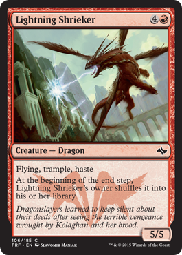 Lightning Shrieker is a welcomed upgrade over Archwing Dragon from Avacyn Restored. For an extra mana, you get one more power and trample. Not only does it give most of the other dragons headaches, it’s also a common. Of course his drawback is that you have to shuffle it into his owners library, but you can consider it as a reusable 5 damage spell of sorts. It’s a great card to use when you have any of the rare dragons in play so you can spread the effects between them. I personally got to play Atarka (double strike) and Silumgar (-1/-1) with him and found the Shrieker extremely effective as a finisher. Just remember that he’s purely offensive. There will be no blocking for him.