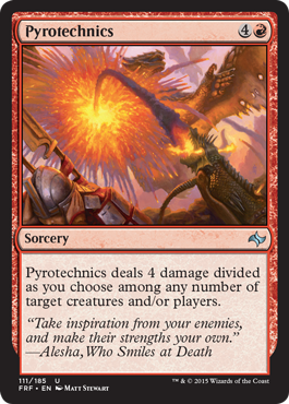 Pyrotechnics is somewhat pricey at 5 mana, but with all the Manifest effects you’re going to see, I think you’ll be willing to pay that so you can take out 2 morphed/manifested creatures. I believe that removal is going to be at a premium in this limited format, and you can count on this card to take out almost anything including the uncommon 4/4 dragons.