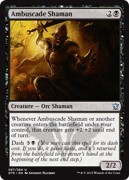Dash creatures work well in those aggressive BW and BR decks, and the Shaman can make your creatures downright nasty. I’d probably play him in a BR deck to be honest along with cards like Goblin Heelcutter, Mardu Scout, Lightning Berserker, and anything else with Dash. I don’t expect the colors to be that popular, so it might not be too hard to get 6-7 dash creatures in the deck to go along with him. If you play a Warbringer things will just get downright silly. You can choose to play him as a 4/4 haste each turn, or drop him and attack with your other haste creatures. I also like this synergy with Alesha, Who Smiles at Death. Bring back a creature, give it +2/+2 . . . there are lots of things you can do with him.