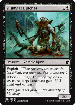 The Butcher is playable I think, but just barely. He has built in removal which is useful, but 5 mana for a 3/3 is cutting it close. At 5 mana I want to be playing bigger creatures and good spells. He does add to the UB midrange Exploit deck though, and gives you a way to both fill your graveyard for Delve and to take out a bigger creature after damage is dealt. I guess 5 mana would mean you have an extra creature to sacrifice to him from turns 1-4, like Shambling Goblin.