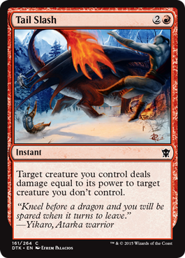So it’s a Lightning Strike with an upside if you have a dragon. I can dig that. Pretty high pick in draft and a must play in your sealed deck I think. There are a lot of 3 toughness creatures in this set, as well as 2 toughness. You’ll probably have at least 2-3 Dragons in your pool, so make use of them and deal that extra 3 damage to the player.