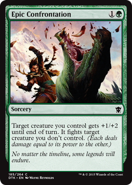 Love this card. While bear punching will go down in history at the most flavorful card from this set (heck, it even became a playmat!), Epic Confrontation is a welcome nod to its forefather. In some ways this is a better card though, as you know longer have to meet the Ferocious requirement in order to activate the +1/+2. This card should have no problems getting rid of even your enemy’s most powerful creatures in a green deck. Cards like Conifer Strider and Stampeding Elk Herd will be more than happy to clear the way of blockers then hit for a huge chunk of damage. I opened 2 in my GR box at the pre-release and they we absolute beatings for my opponents.