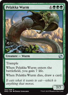 We have all this ramp, but what for? Well, Pelakka Wurm is a prime argument for playing ramp in your deck. Pelakka Wurm is the best non-rare finisher in the set: 7 power, 7 toughnes, 7 life, and you draw a card if he dies. He must be answered with removal if he hits the battlefield because there is little that can deal with him. You opponent will have to throw 3 bodies in front of him just to slow him down, and if you have removal for their creatures it’s game over. Its only draw back is the triple green casting cost. If you want to be able to cast him easily, you’ll need to be playing a 2 color deck with green as your main color, but it would be possible to splash a 3rd color in there if you wanted to. I like GB Ramp/Sacrifice as his home, but UG Graft with a splash of black for removal might not be bad either. I might possibly take this card as a first pick if my rare isn’t too exciting, though I’d be careful not to build around it if the cards weren’t there.