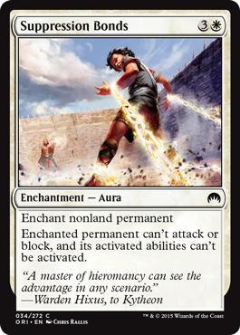 White’s removal this time around is so-so. Suppression Bonds does a good impression of Arrest, but why the 4 mana? Was a 3 mana enchantment lock down effect really that strong? The only reason I can guess they moved this to 4 more was to make it a better card to use alongside Starfield of Nyx since it would become a 4/4 creature. Regardless of why it’s 4 mana, it’s still alright as far as removal goes, but not the best white has to offer. Not a high pick in draft, but there’s a 50/50 chance it won’t come back around if you pass it up in draft in packs 2 and 3.