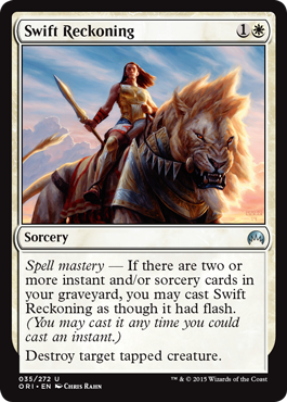 I’ll say it again; limited is an aggressive format with lots of attacking creatures. This makes Swift Reckoning a rather good card in Origins limited, but what makes it even better are cards like Grasp of the Hieromancer, Kytheon’s Irregulars, and Sentinel of the Eternal Watch. Even if your opponent wants to hold back that big creature, they don’t have a choice in this matter. You can tap it down with them, then take it out with Swift Reckoning after combat OR during combat if you have 2 other instants/sorceries in the graveyard. I think this is another card you want to take highly in draft, perhaps even higher than Celestial Flare because of its ability to kill any tapped creature. The more synergy you can acquire with this card, the better. High pick in draft, must play in sealed.