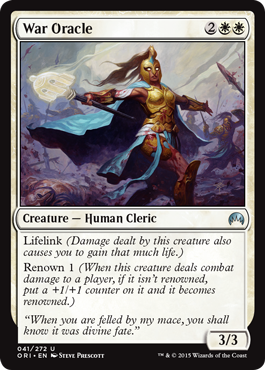 Not the best of the white renowned cards, but still decent. Lifelink is definitely a welcome ability, and if you can use tap down effects like Sentinel of the Eternal Watch’s or Grasp of the Hieromancer the renowned ability becomes much better. Nice, but not absolutely necessary if you open/draft a better card in the 4 mana slot. Play it for synergy, but don’t force it into a deck if there’s a better choice.
