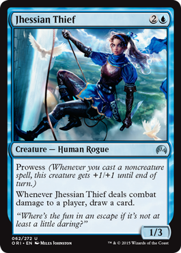 Speaking of card advantage, Jhessian Thief is also worth considering, especially if you have ways to give her evasion. Stratus Walk comes quickly to mind, but Whirler Rogue is also pretty good with her. If you can do that, she’s worth playing in your deck but otherwise I think you’d be better off with a creature with a higher power level and better ability.