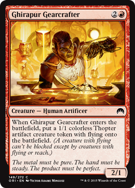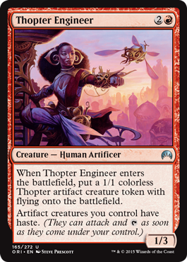 Here’s the other guy I was talking about. He’s not as good as the Engineer, but he still gives you 2 creatures for one card. I would probably pick him over most of the other red creatures in this set. I can’t stress enough how excited I am to build a UR Thopter deck in draft or to even use these in sealed. They are good in a vacuum, but even better when the synergy from the other artifact/thopter themed cards are online.