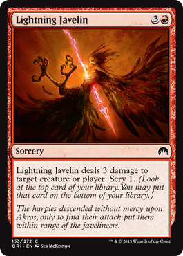 This is probably the best burn spell we’ll get a common. I don’t see why they couldn’t have reprinted something like Bolt of Keranos for 3 mana (which does the same thing), but oh well. I’ll take 3 damage to anything and 1 scry for 4 mana and be happy for it. It’s not a card I’d take highly in draft if other removal was available, but if it came around the table I’d pick it up. Probably a higher pick in the 2nd and 3rd packs of draft once you’ve decided to play red.
