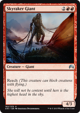It’s strange to see the color wheel get bent out of whack, but the flavor explains it well. Reach is usually a green ability, but giants often tend to be red so Skyraker Giant makes sense. I’m not complaining. If you’re getting pounded by 1/1 thopters, birds, or drakes the Giant will make sure they stay away from your head. A 4/3 vanilla creature for 4 mana would usually JUST make my deck of 23 cards, but a 4/3 with Reach will ALWAYS have a spot in a red deck in limited. When it’s not swatting down pesky flyers, it will do an alright job of being a beater as well. Another solid red card.