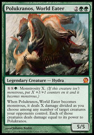 I don’t think the metagame will miss him that much since he’s been hated out of standard for a while now, so don’t expect a big shift in ramp’s strategies to fill the void. As for Polukranos usefulness outside of standard, we haven’t even begun to scratch the surface of Nykthos devotion decks in eternal formats, and we could possibly see him show up in the future in a modern metagame full of Tasigurs and Rhinos. Not saying it will happen, but just saying there’s a possibility he could find a home. I’m gonna sit on my $1 World Eaters until it happens (since I didn’t get rid of them earlier).