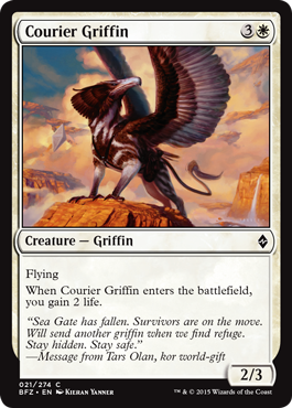 For example, Courier Griffin is a decent flyer for 4 mana, and the added life gain helps the Steward. If you are playing this alongside other lifelink creatures and have a card like Felidar Sovereign as one of your win conditions, it can be pretty good. Playing this on turn 5 with a Steward in play would let you get a 3/4 flyer for 5 mana which isn’t bad at all. The Griffin is a roleplayer, and will block small Eldrazi and other threats in the air or give you a little bit of evasion as well. Another solid choice in limited.