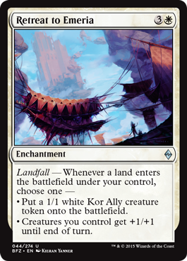 Continuing the topic on Landfall, Retreat to Emeria and pretty much the ENTIRE Landfall enchantment cycle for each color is great. White is one of my favorite though. You’re going to get either a few creatures out of this or you’re going to be able to make an overwhelming attacking. This is a great card to have in an Ally deck near the top of your curve but it can fit in just about any other deck you want to build as well. It will be great in both sealed and draft. I wouldn’t be surprised to see this go early. I’d take it as one of my first few picks. I could see it doing well in GW Landfall especially alongside other ramp sorcery spells like Sylvan Scrying.