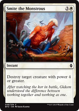 Sheer Drop is a much better card that Smite the Monstrous I think. You’ll still have to chump block that Eldrazi before you can use it since it’s sorcery speed, but 3 mana isn’t bad for a kill effect in white, and you get the added bonus of making a 3/3 Elemental Land with haste if you pay 6 mana later in the game. Easily splashed in a 3 color deck if you can put one together. Not as good as Stasis Snare, but almost as good.