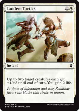The last card I’d like to feature today is Tandem Tactics. This card is mostly an Ally deck card, especially if you have a card like Serene Steward in play. If Theros taught us anything, it was that combat tricks can be just as good as removal if you play them correctly. Tactics plays well both on offense or defense, and at 2 mana it’s aggressively costed. The 2 life you get is just icing on the cake. I think it will be a better draft card, but be sure to consider it in your sealed pool if you have cards like Felidar Sovereign or Serene Steward in your pool.