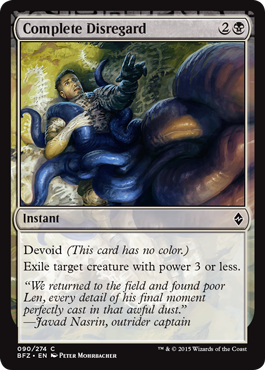 Yep. The Eldrazi get all the cool toys. Three mana for a black exile effect at instant speed. Sure it will only take out those pesky Ally cards or small flyers at 3 power or less, but I’d probably play this over Demon’s Grasp in my main deck if I didn’t have room for both. It has good synergy with blue cards like Tightening Coils, but having to play those type of cards together will probably only make your deck worse. It’s not a Ruinous Path, but it will definitely take out a good number of creatures. Your pick of removal isn’t that great in BFZ, so take it rather early in draft if you can.