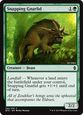Scythe Leopard and Snapping Gnarlid are your basic Landfall creatures. If you’re building a GR Landfall deck and need to fill your curve out these are good choices. You might think that the Leopard is better due to its speed, but in this format Gnarlid’s 3-4 power after its bonus is much better than the Leopard’s 2-3 power level (with something like an Evolving Wilds or ramp effect like Natural Connection). I played against some Naya and GR Landfall decks at the pre-release and Snapping Gnarlid was able to sneak in 5+ damage in those early turns most of the time. It was a pain in the neck. The Leopard is there if you have lots of good Landfall synergy, but otherwise just place Gnarlid.