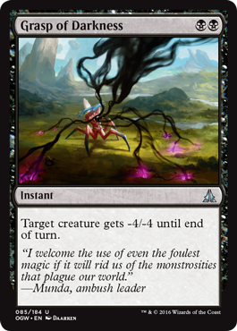 You may think that double black casting cost is restrictive, but like I said above, I wouldn’t be surprised to see a mono black eldrazi archetype develop in OGW/BFZ limited. If Tar Snare kills 70% of the creatures in the format, Grasp of Darkness hits around 85% which includes almost all of the flyers. This is an amazing removal spell in limited, and possibly a first pick depending on what your rare is. I’d much rather have strong removal in this block than anything else. This is going to be a limited all-star along with Oblivion Strike.