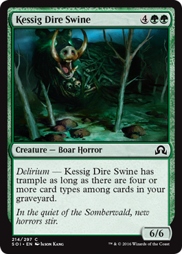 Kessig Dire Swine is a good finisher and by the time you cast him you’ll probably be able to activate delirium. That means come turn 7 you’ll have a 6/6 trampler to attack with. If your deck is lacking some finishing power and needs some threats I think this Swine will get the job done. He’s hard to kill with most removal and there are very few creatures that can deal with his power. I don’t know if you’ll want multiples of him, but I could see using 2 in a UG tempo based deck. Not for every green deck (don’t think you’d want him in a GR werewolf deck), but playable.
