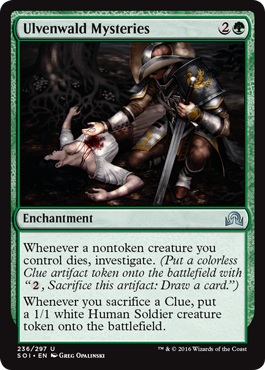 Another good card for UG clue decks is Graf Mole. The clue strategy seems like it would take a while to get going so being able to draw cards and gain life at the same time will be important. The mole is also a great defender and not too expensive to cast. I think it will show up in many other green decks as well just because a 2/4 body for 3 mana is a little rare and much better than most of the 2/3 creatures out there. Even if you’re not devoted to making clues, the incidental life gain will help out quite a bit in SOI limited.