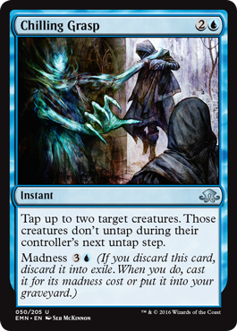 Blue just doesn’t stop with it’s Sleep effects. Chilling Grasp is one of those rare cards that you’d rather cast for it’s regular casting cost than it’s madness cost, but it does give you the option of discarding it for an ability like Advanced Stitchwing’s and still get its effect. The instant speed and two targets makes it much better than Press for Answers or other tap effect, and I think this card will be worth a slot in any blue deck, especially one built around tempo like UG or UW.