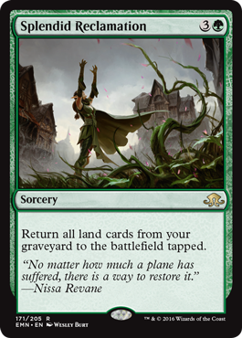 This cards SCREAMS to be abused by Landfall. The problem is getting all of those lands into the graveyard first. It will have to be some kind of delirium/reanimator deck that is able to toss cards into the graveyard easily and then it will have to have a huge payoff like Omnath, Locus of Rage. If you have a card like Kolaghan in play to give your creatures haste, reanimate an Omnath, then play this card it would win the game instantly. I think that’s too magical christmasland though. I’m still going to try and work this into an Omnath deck tough, perhaps even with Reckless Bushwhacker to give all those elementals haste. Sounds like a fun challenge.