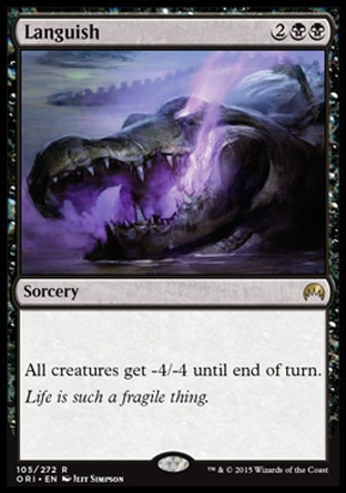 What made Languish such a key card in recent standard decks was it’s 4 mana casting cost. In the past we had Damnation and Day of Judgment at 4 mana, but now if you want any kind of board wipe you have to pay 5 mana or more which was just too much against hyper aggressive decks like humans. Control decks in standard such as Esper, Sultai, and Mardu will definitely feel more pressure from fast decks now and have to stock up on early removal. Planar Outburst could possibly see more play with Languish out of the picture, and I also think that most control players will be leaning back towards white now that black will no longer be viable. As for its life after standard, I don’t think it will see much play at all outside of casual formats like Cube and EDH.