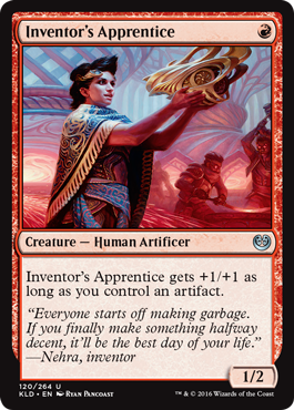 Inventor’s Apprentice is good if you’re playing an aggressive deck, like RW along with a Toolcraft Exemplar, and you shouldn’t have that much of a problem making it a 2/3. That’s kind of a big deal for a one mana card. Good synergy with Fabricate and vehicles, but probably not something you want to first pick in draft. Worth considering for your limited deck but not absolutely necessary I think.