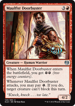 Another solid energy card, and even though it’s a bit of a glass cannon, Maulfist Doorbuster’s ability takes care of that. I don’t know how often you’ll be using his ability, but having the option to get rid of an opponent’s best blocker lead to some awkward blocking by them to stay alive. Seems like it would be good in a energy deck with some good combat tricks like in black or white. While I would splash the Artist in a 3 color energy deck, I don’t think Maulfist Doorbuster would make the cut. It’s alright in a 2 color energy deck, but in 3 colors I’d want something with a little more impact.