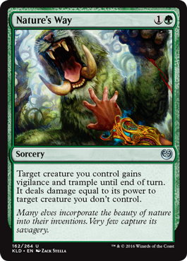 Hunt the Weak makes a return to standard in KLD, and it should see some play in KLD limited. I like the first 2 removal cards I talked about previously, but Hunt the Weak will get the job done most of the time. It pumps your creature and usually gets rid of your opponent’s , but that 4 mana to cast and sorcery speed hurt it. I don’t expect them to go too highly in draft, but don’t let them pass you up. Removal is removal.