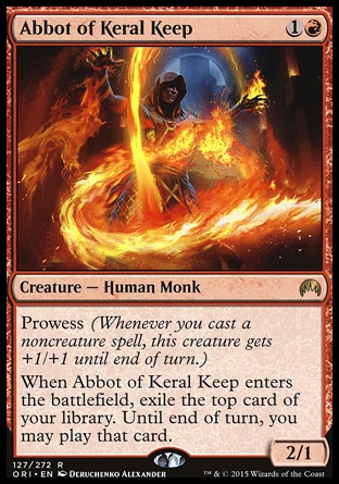 While there are a number of ways to build Red decks (Red burn, Atarka Red, Mono red aggro, UR Prowess), there’s no denying Abbot of Keral Keep ($1.25). It was a great way to give red decks gas when they started slowing down after emptying their hands, and the Prowess triggers made it as dangerous to block as Monastery Swiftspear if you could threaten with both Become Immense or Temur Battle Rage. It won’t see tons of play, but I expect it to be in a few decks. More so than Zurgo Bellstriker which might see some more life if the right red deck can start winning.