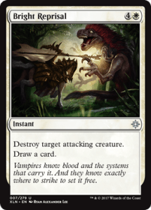 I guess Reprisal would be really overpowered in this format, so instead we get Legion’s Judgment which is 1 mana more and sorcery speed instead of instant. It won’t be too useful against vampire and pirate decks, but it will do a great job of taking out a player’s dino finishers. Bright Reprisal also isn’t Immolating Glare, and heck, it even isn’t Divine Verdict either. It’s incredibly heavy and only hits attackers which means it’s situational, but at least you get to draw a card out of it. Still, it’s better than nothing. Once you play it, your opponent will play around it in the next game and try to attack with weaker creatures, which means you’ll have to have something really menacing to force your opponent to attack with their finisher or bomb. It should be good against those 5 mana hasty dinosaurs at least.