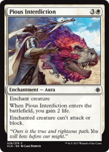 Pious Interdiction is a much worse Pacifism, but at least it gains you 2 life. If you’re playing a vampire deck that’s using your life total as a resource, it’s a great card to have since it gets rid of a problem card and gains you life. It’s fine in any other white deck, but I would draft it higher in vampire ones.