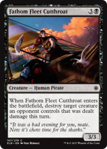 Fathom Fleet Cutthroat isn’t quite a Raid pirate, but his ETB does rely on you attacking. I’d personally play with him in a RB pirates strategy to give you access to more damage effects so you can always destroy a creature when you play him. If you’re facing dinosaurs and can’t fight through them, Fathom Fleet Cutthroat is your David to their Dino/Goliath. It’s a high pick for me in limited, even though it’s only a common. Great for aggressive decks too.