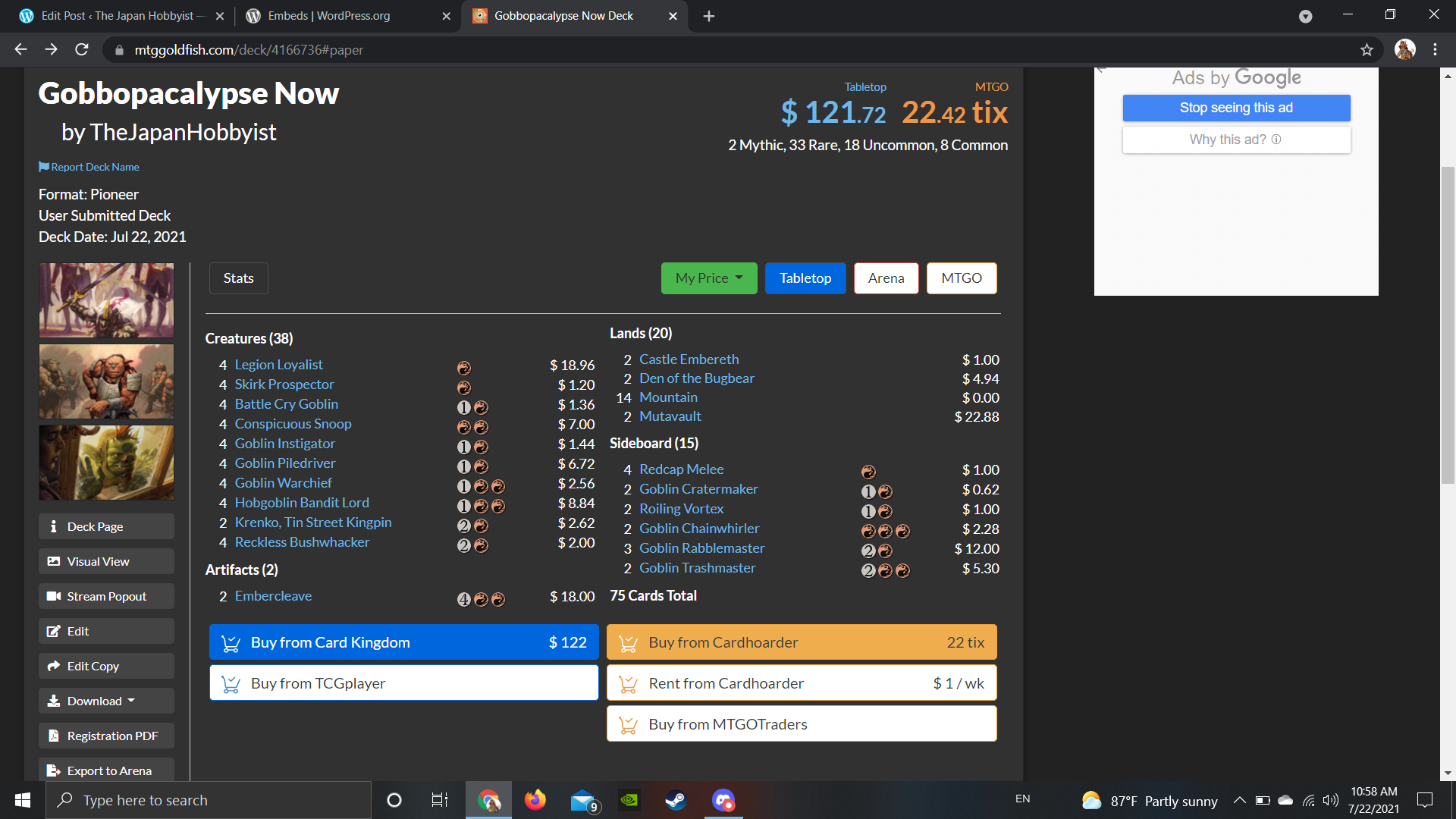 Lady’s and gentlemen, I apologize for the absence on my blog, but I’m sure you’ll forgive me and yourself for not being in the mood for competitive Magic the Gathering much over the past year or so. I just want to have fun, and there haven’t been many formats, let alone decks that have screamed as loudly as Pioneer Goblins that they are a blast to play. Today’s deck is not only fun, but also incredibly budget minded, rewarding to play, and exciting. If you’re looking for a deck to try out when paper Pioneer starts in your area in the future, consider building “Gobbopacalypse Now”!