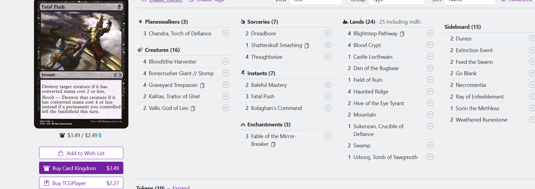 Apologies for the screen shot, I’ve still not figured out how to embed things like decklists into my articles without having to pay money for a pro service and plugins so you’ll have to bear with me. The big changes for this deck are adding the Kolaghan’s Command back into the main board. I did this mainly to help against the Greasefang and Winota decks, especially since it can kill an Esika’s Chariot as well as a creature that could crew it. I’ve also foregone using Kroxa in the deck because I felt like it was helping out graveyard decks too much, was being bounced or exiled a lot, and it also faired poorly against fast aggro decks. Valki, God of Lies seems fine early on against aggro or even just to get info against an opponent and is an amazing late game draw. The Fable tokens also can help to speed it out a few turns sooner. I also dropped the Bloodchief’s Thirsts for Baleful Mastery so I had instant speed removal. In the sideboard I added 2 Ray of Enfeeblement for Winota match ups, Feed the Swarm for Enigmatic decks or other problem enchantments, and Extinction Event for go wide or go big aggro strategies. It might not be optimized yet but we’re definitely on the right track.