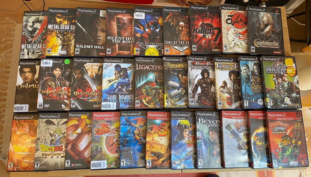 My Playstation 2 collection is probably the pride and joy of my entire gaming collection. It has stayed largely intact over the years but I did stupidly sell a few games away thinking I didn’t need to play them again (I sold away Silent Hill 2, .hack 1-3, and more over the years). I’ve been able to pick back up some old games I had that I liked (the Onimusha games), some new ones I had always wanted to play (the Prince of Persia series), but most of these games are the originals I picked up while I still worked at EB games in university. As with my PS One collection, I absolutely loved my RPGs on the PS2. I managed to complete quite a few series but there are still some games I’m missing and would like to get my hands on: the rest of the dot hack games, Suikoden IV, and Wild Arms 5 for starters. I’m hoping that in future visits to the USA I’ll be able to secure some if not all of them.