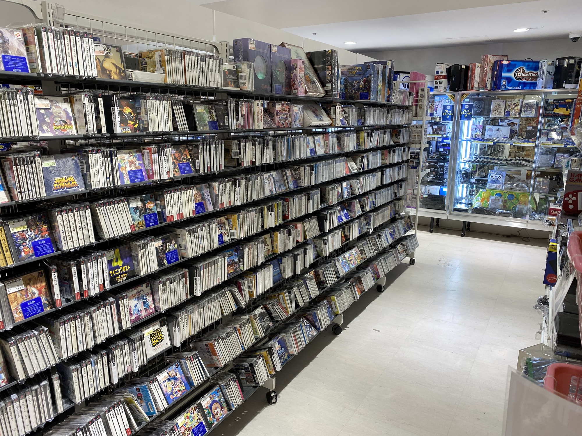 Their rare and pricier games and consoles will usually be held behind glass showcases. In the pictures above you can see areas devoted to Super Nintendo (Super Famicom), Nintendo Handhelds, and Neo Geo, but there are actually much much more. You’ll find other showcases with newer systems like Playstation 5 here, as well other retro systems like the Playstation 2. If what you’re looking for isn’t in the shelves, be sure to check the showcases.
